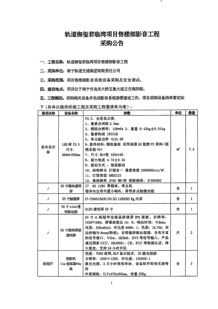 軌道御璽君臨灣項(xiàng)目售樓部影音工程采購公告